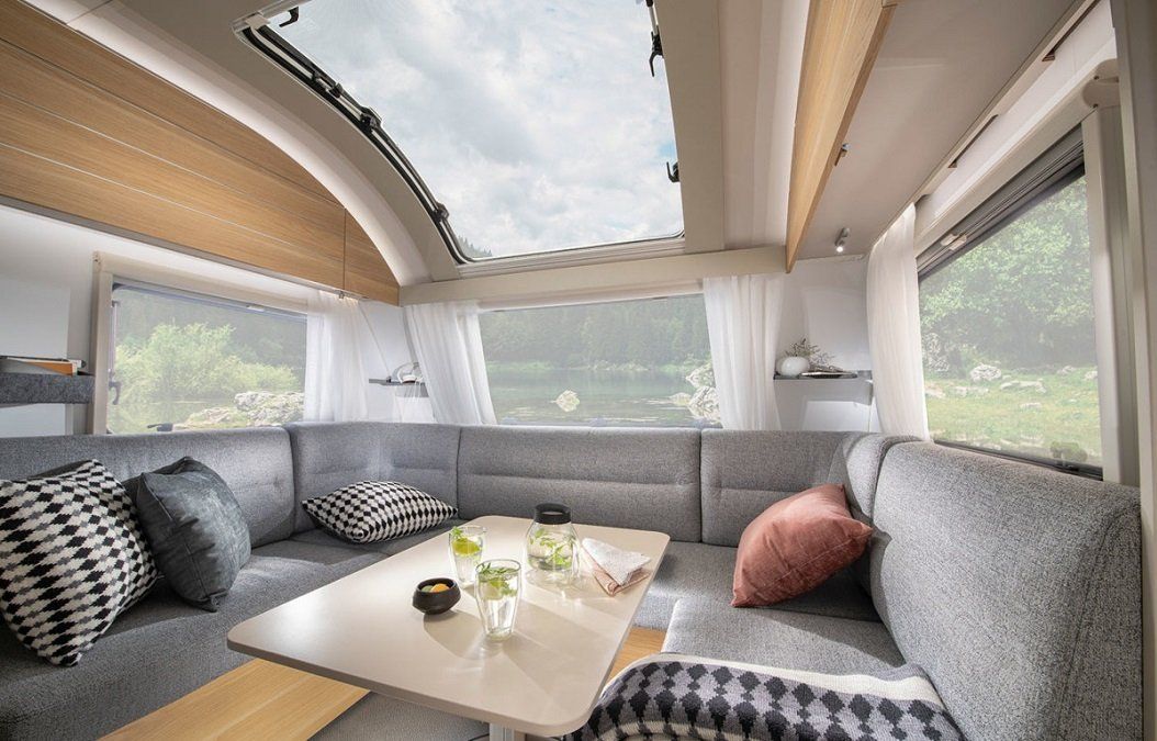 Bei Tag hat man rechts vom Eingang eine große gemütliche Sitzecke mit Tisch. Man sitzt unter dem großen Panaorma Fenster, welches die Adria Adora Modelle auszeichnet.