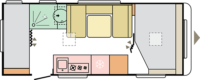 Bei Tag hat man links vom Eingang das quer verbaute Doppelbett für die Kinder. Rechts folgt die Küchzeile samt gemütlicher U-Sitzgruppe und großem Tisch. Und im Bug des Wohnwagen befindet sich das bequeme "Eltern.bett